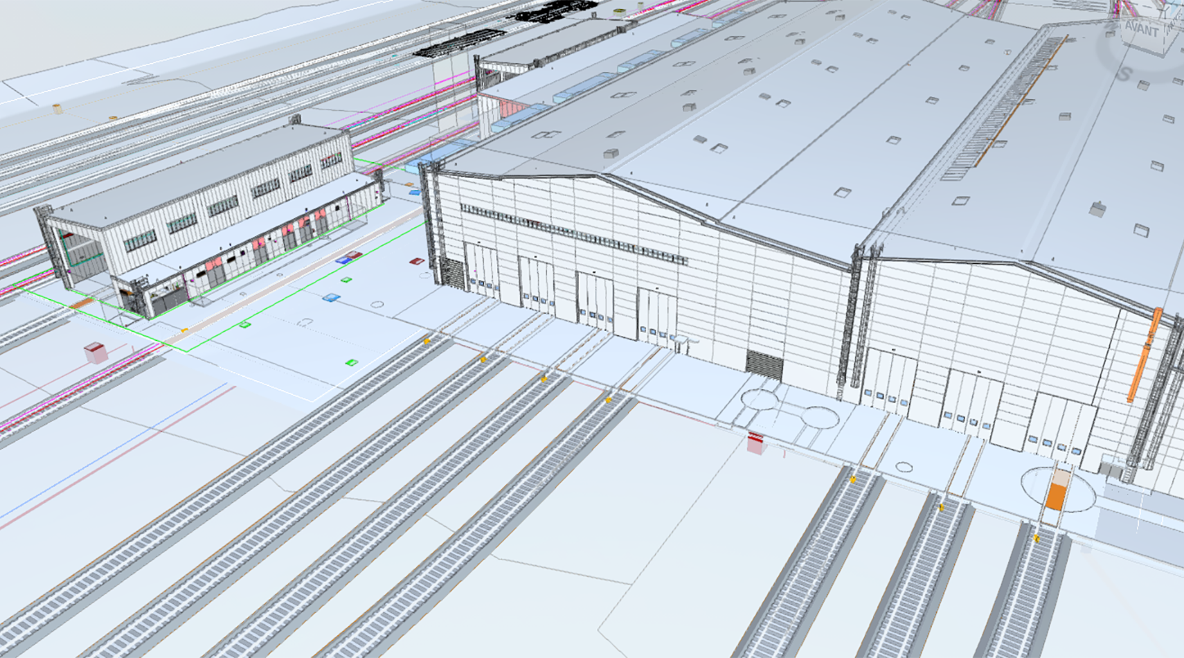 L'image représente une maquette BIM fédérée d’un dépôt, intégrant la voie ferrée, les systèmes, infrastructures, etc.