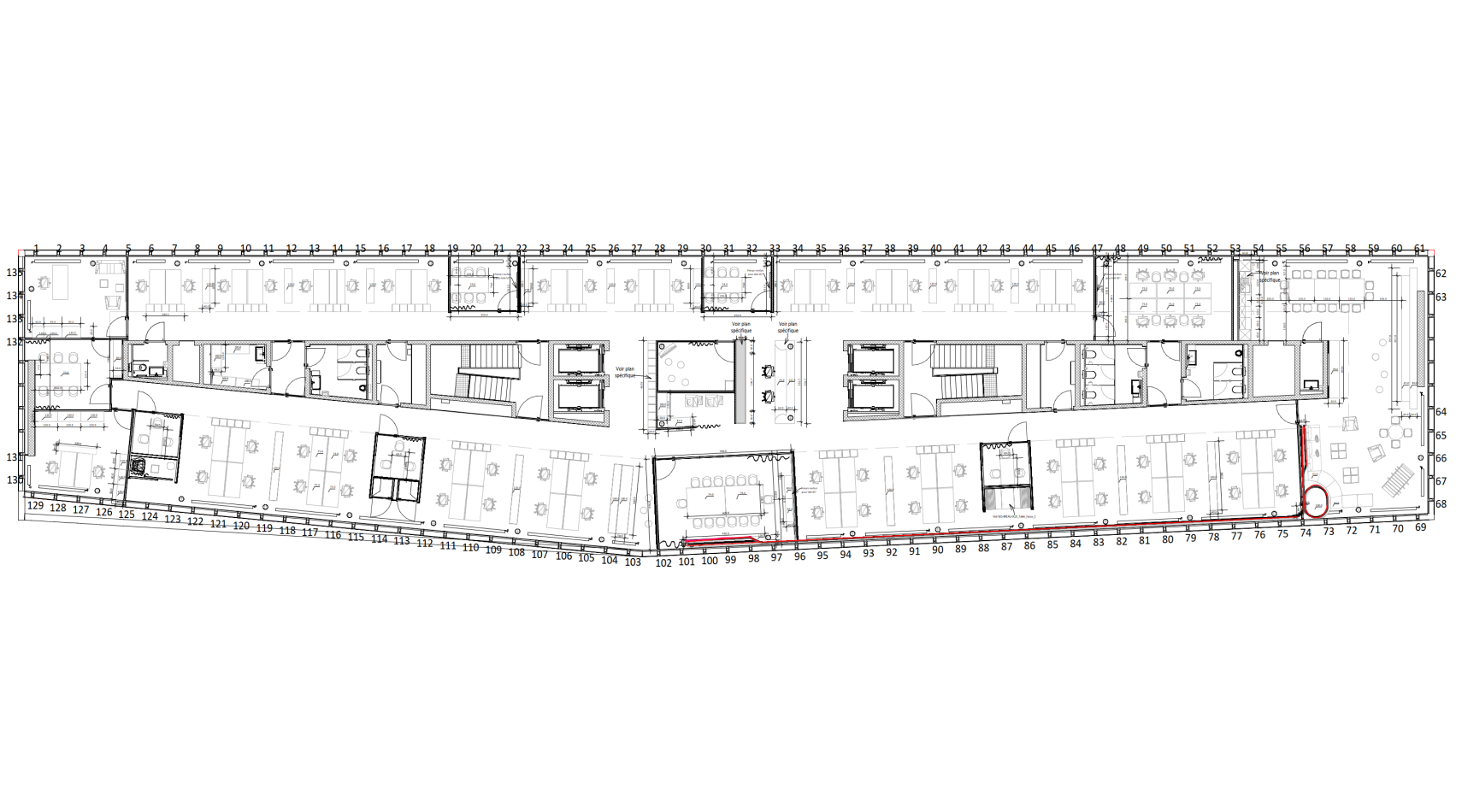L’objectif de ce train est d’amener le café de notre cafétéria vers notre grande salle de réunion (tracé rouge sur le plan).