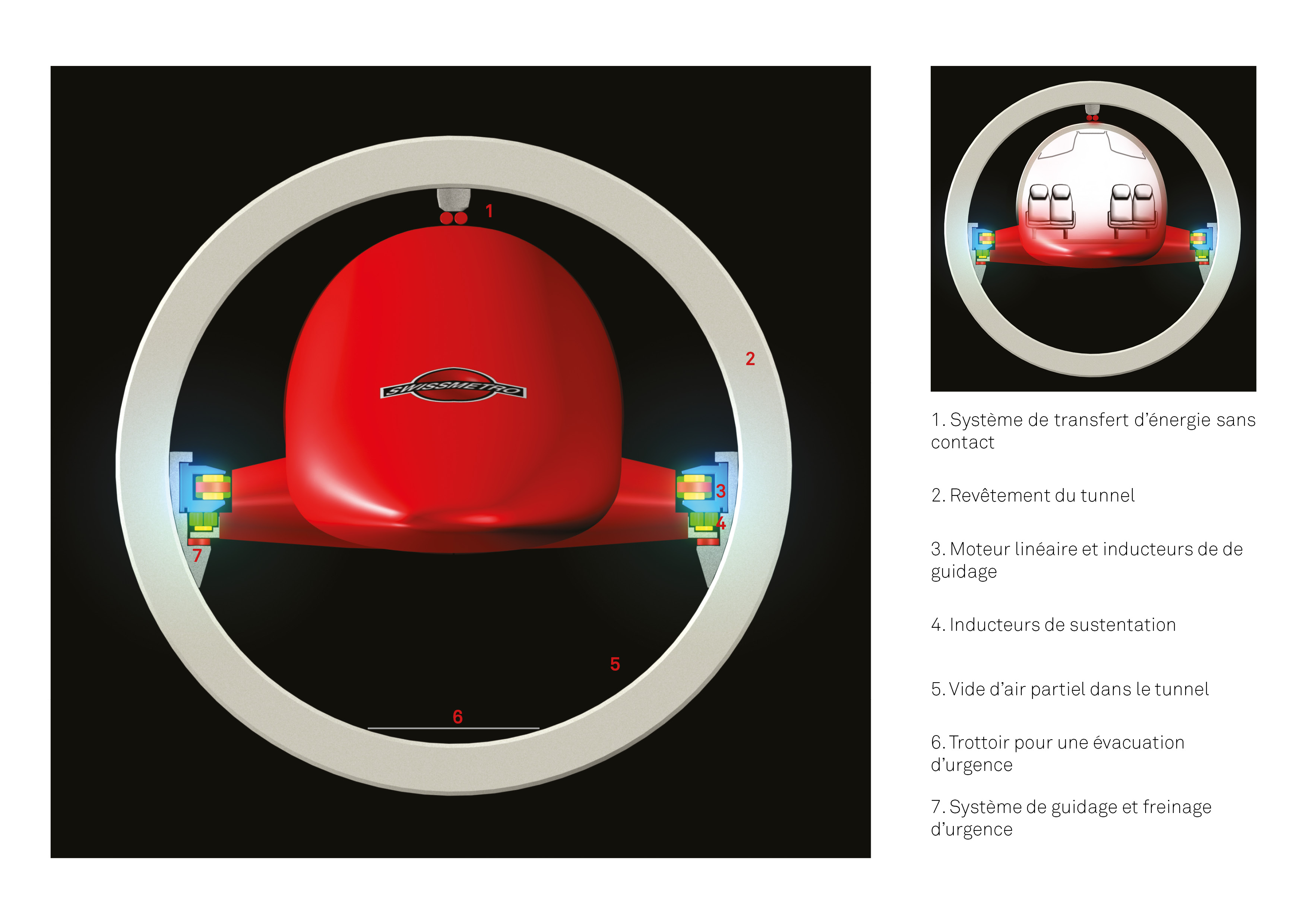 Ces technologies permettront aussi de minimiser les efforts sur les différentes structures, le niveau de bruit ainsi que les coûts énergétiques et d’entretien. Enfin, pour limiter le diamètre des tunnels et assurer une importante économie d’énergie, la quantité d’air dans les tunnels sera réduite à des pressions semblables aux conditions atmosphériques que l’on trouve à une altitude de 15'000 mètres. Ce vide d’air partiel sera assuré par des pompes à vide, situées dans les tunnels tous les 15 kilomètres.